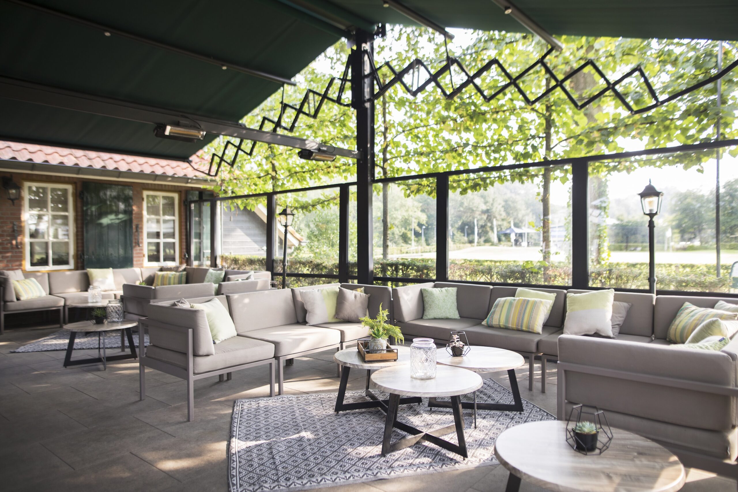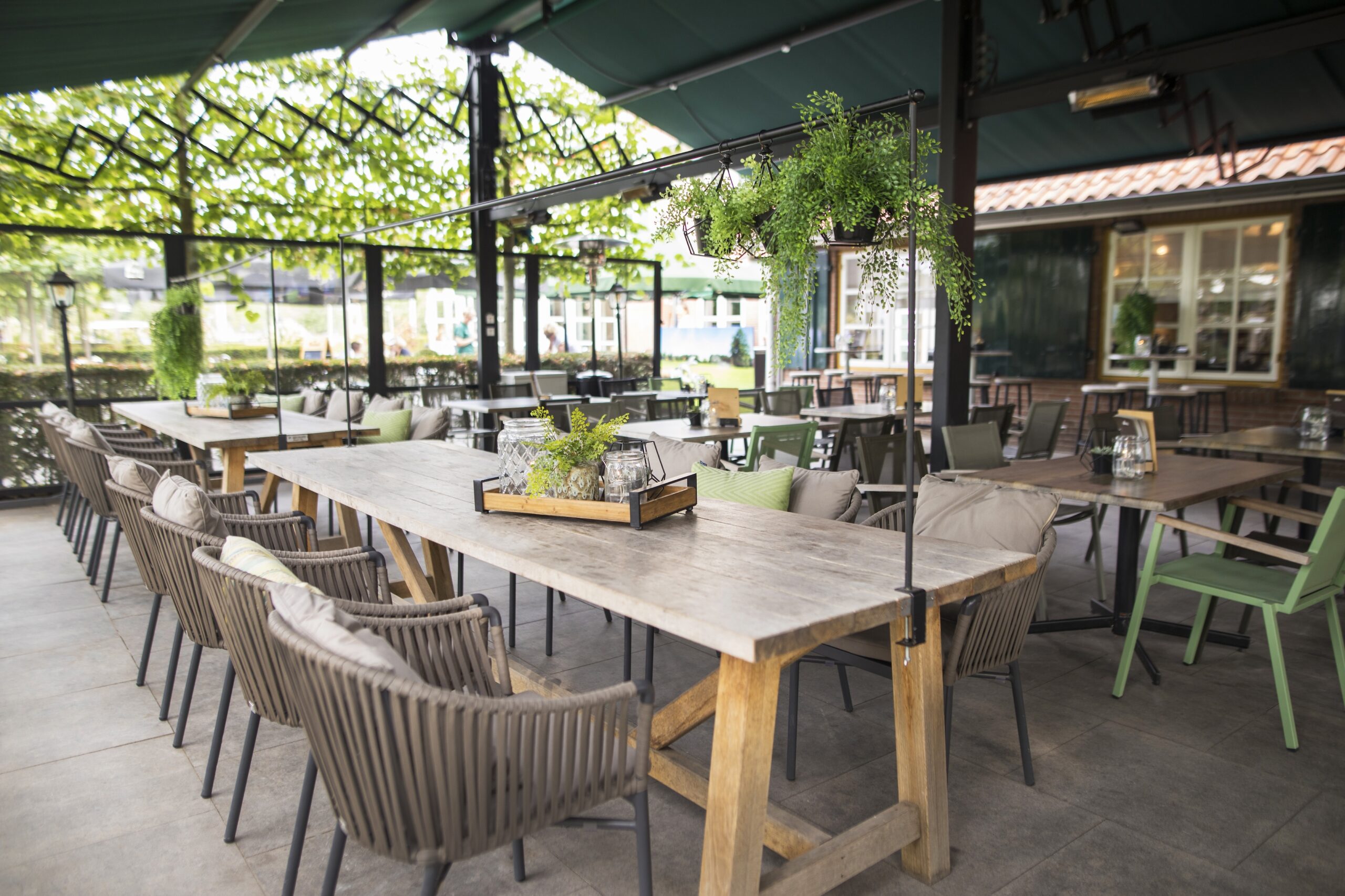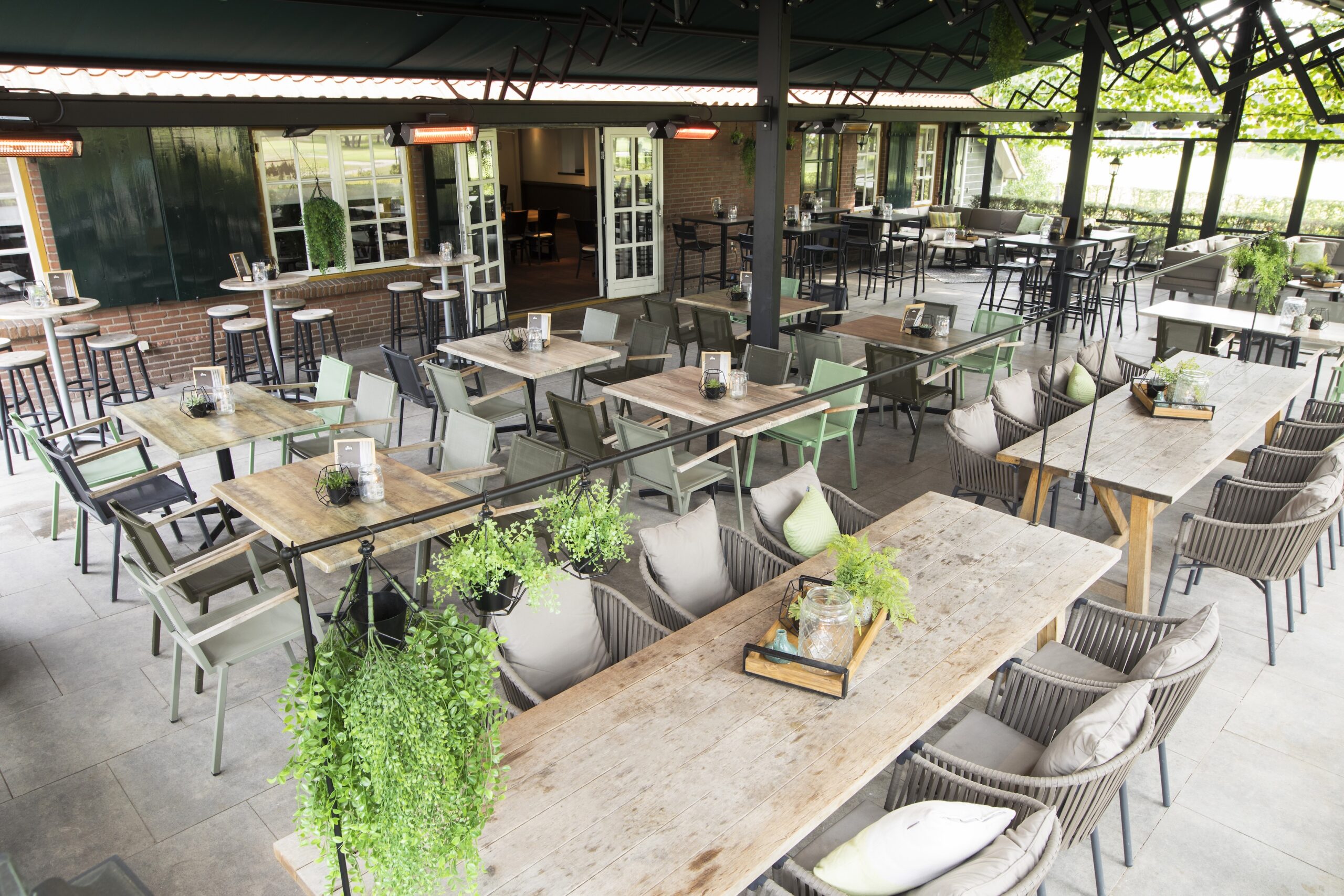 De Overkapping is een sfeervolle buitenruimte midden in het groen van Prise d’Eau. Deze overdekte locatie heeft zowel lage zitplekken als statafels, kan bij mooi weer worden geopend en is voorzien van warmtelampen voor koelere dagen. Perfect voor een borrel, lunch, diner, feest of afsluiting van een golfdag. Geschikt voor grote groepen en volledig exclusief te reserveren.
